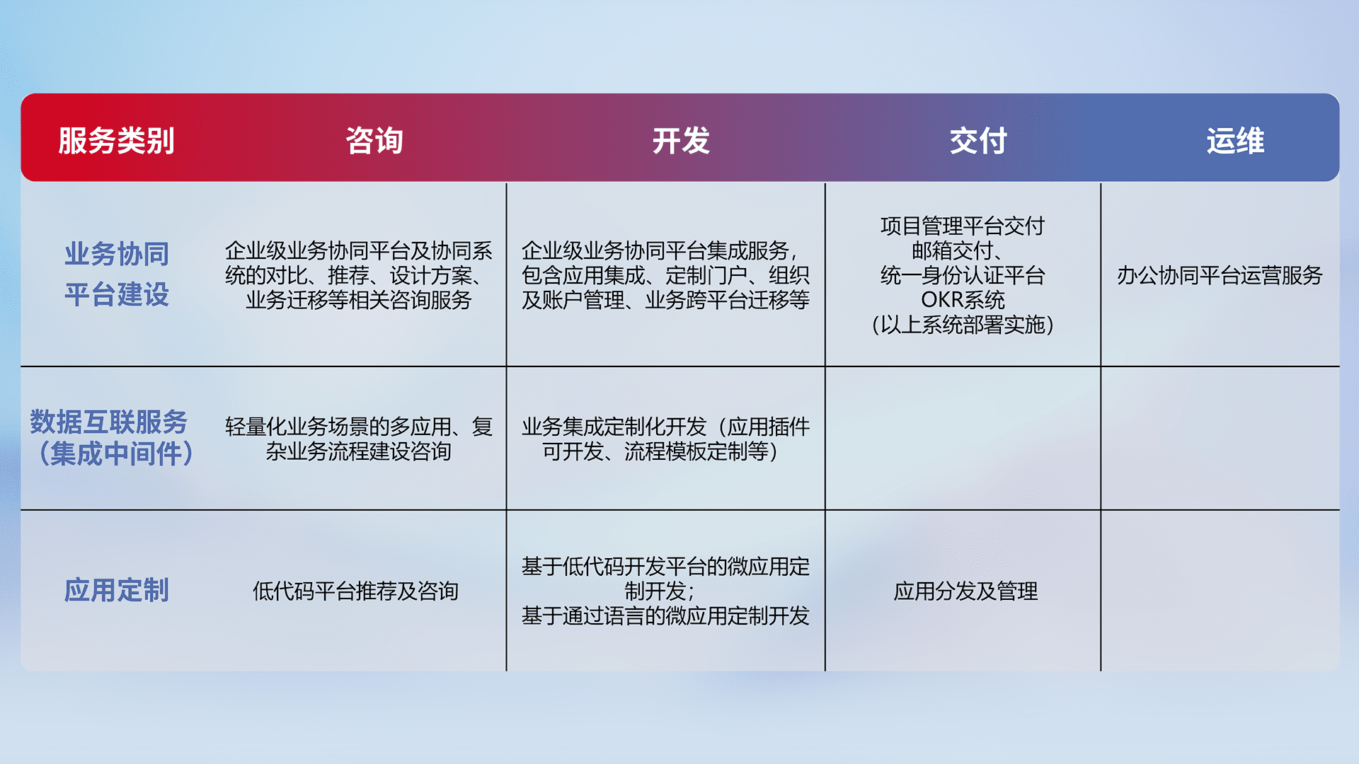 针对钉钉、、企微、、、IDaas等平台级产品提供产品的规划、、方案、、、、交付、、、、定制化开发等服务,,,,实现如统一协同办公、、、智能客户服务、、、混合会议管理、、智能数据查询、、等业务场景,,,,实现数字化转型。。